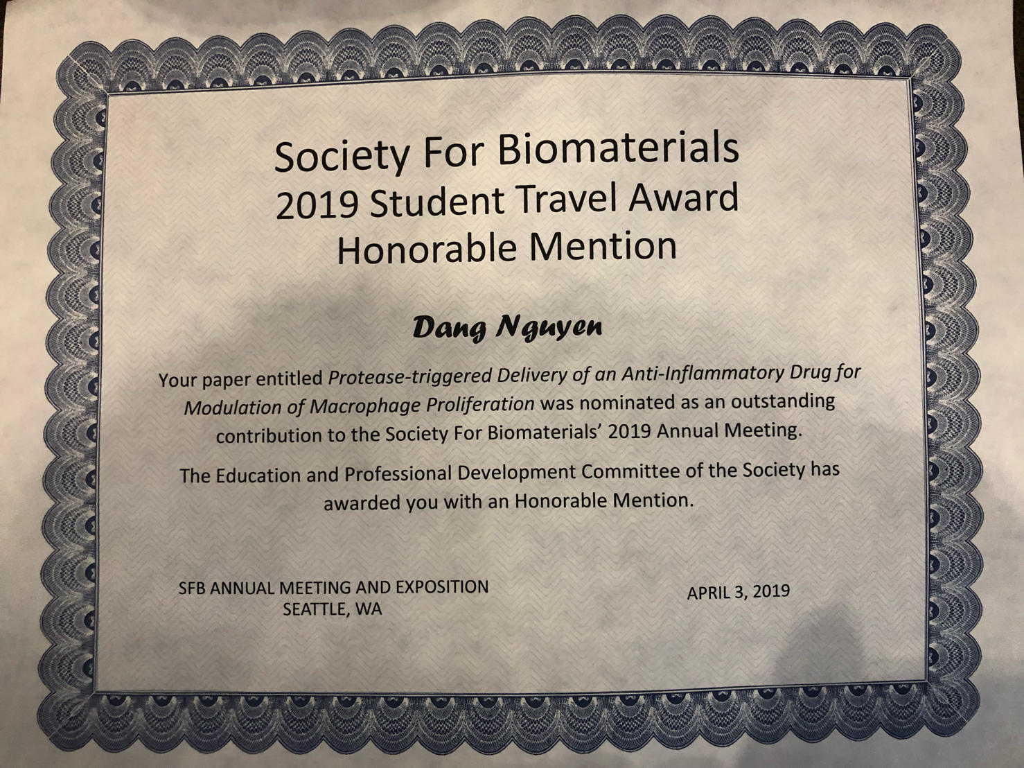 03/04/2019: Tri Dang received a STAR Honorable Mention from the Society For Biomaterials, USA for his thesis research on "protease-triggered delivery of an anti-inflammatory drug from macrophage modulation". Congrats, TD!